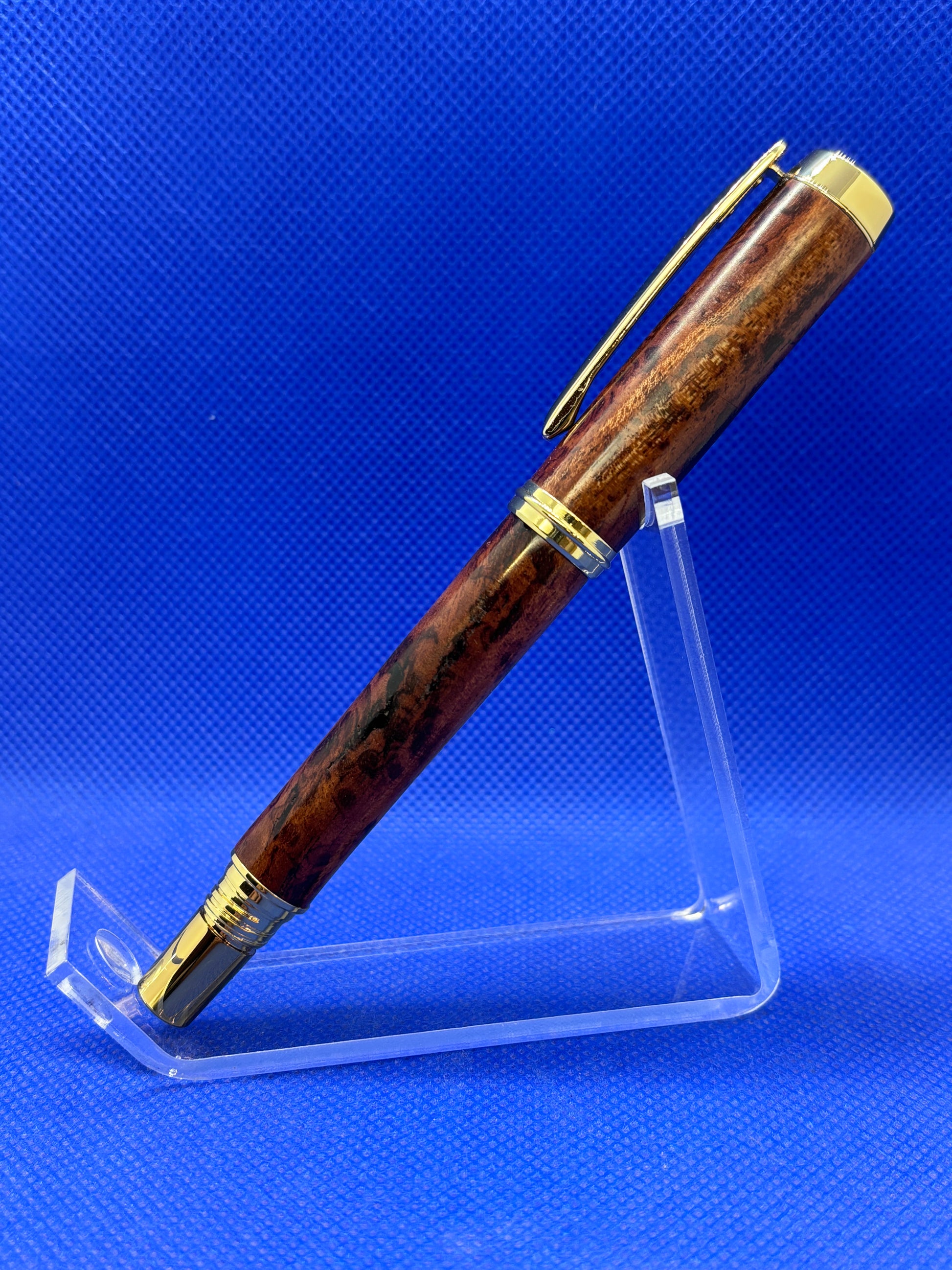 This Wilfred fountain pen features a spalted West Indian Mahogany body with gold metalwork. This is a stunning pen that uses either universal fountain pen cartridges, or an included ink pump for filling from an ink bottle.
