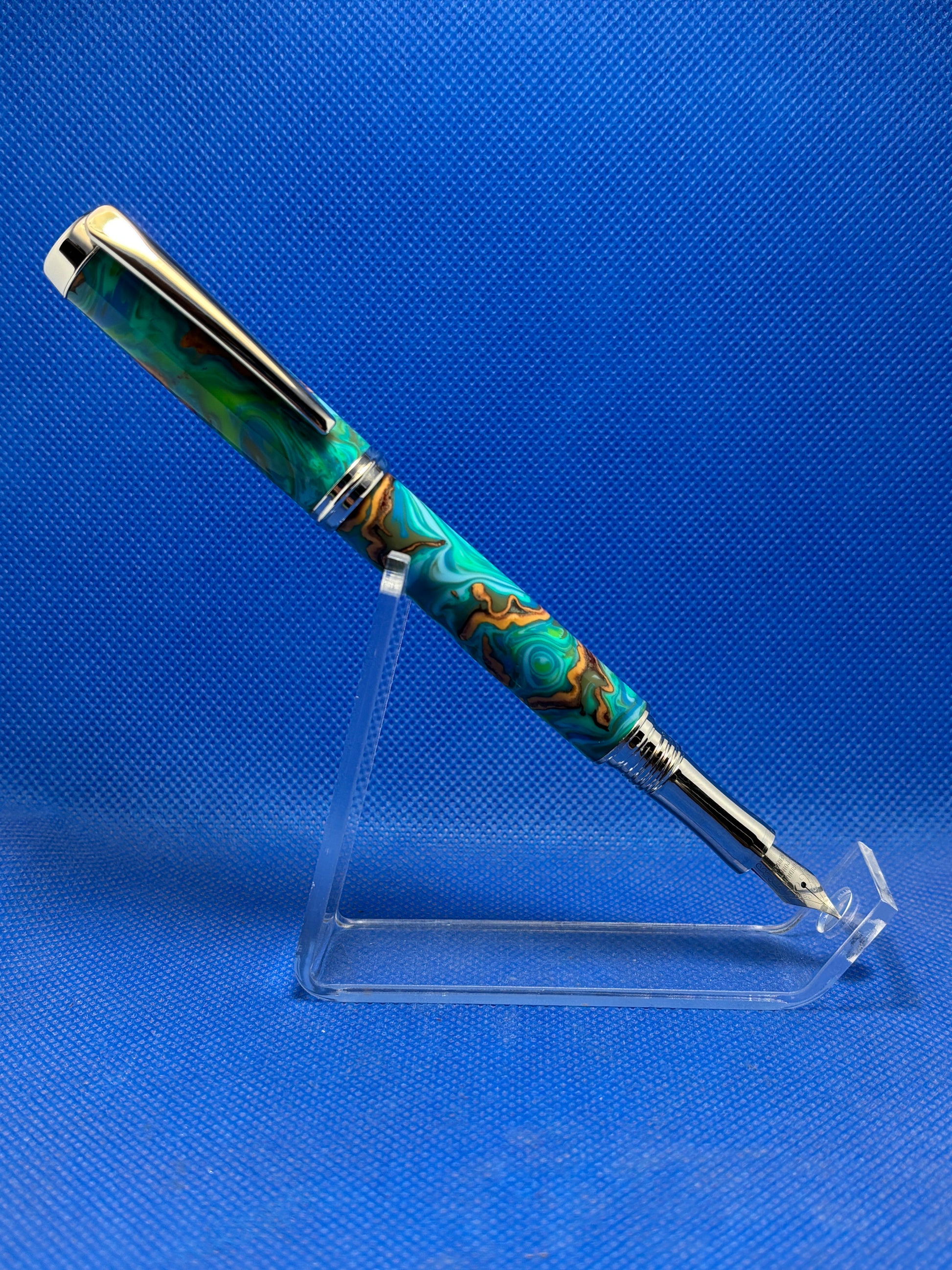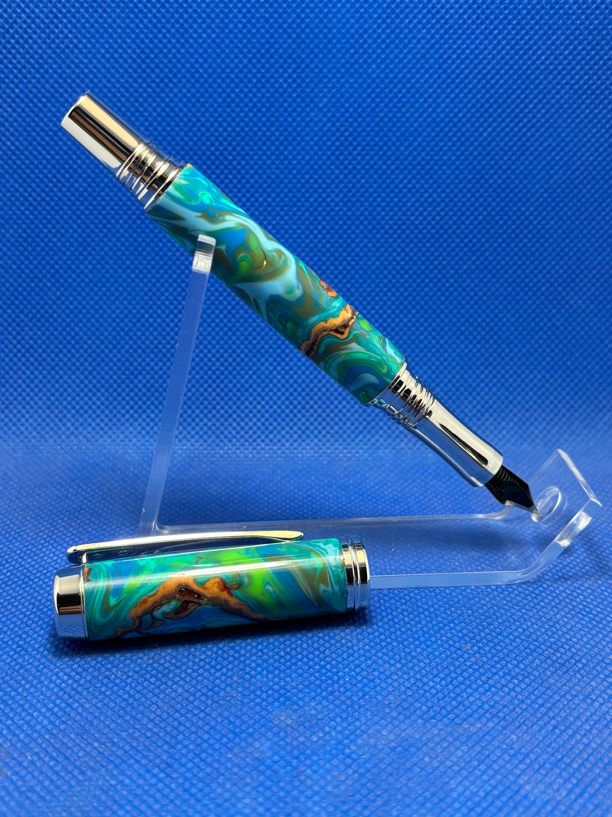 This fountain pen features a multicoloured resin body and bright rhodium trim. For an added touch of contrast and fun, there are walnut shells embedded in the resin. This is a stunning pen that uses either universal fountain pen cartridges, or an included ink pump for filling from an ink bottle.