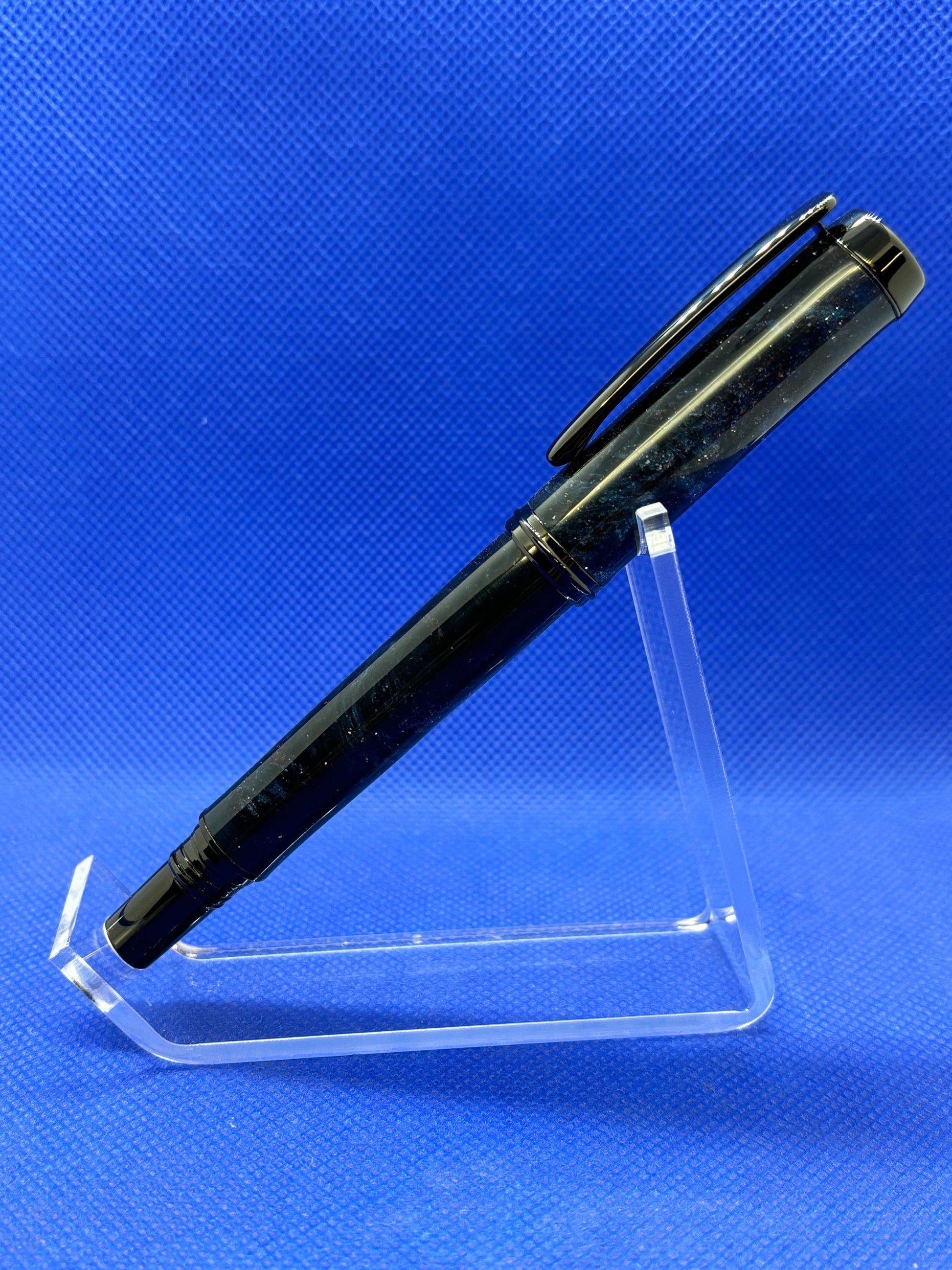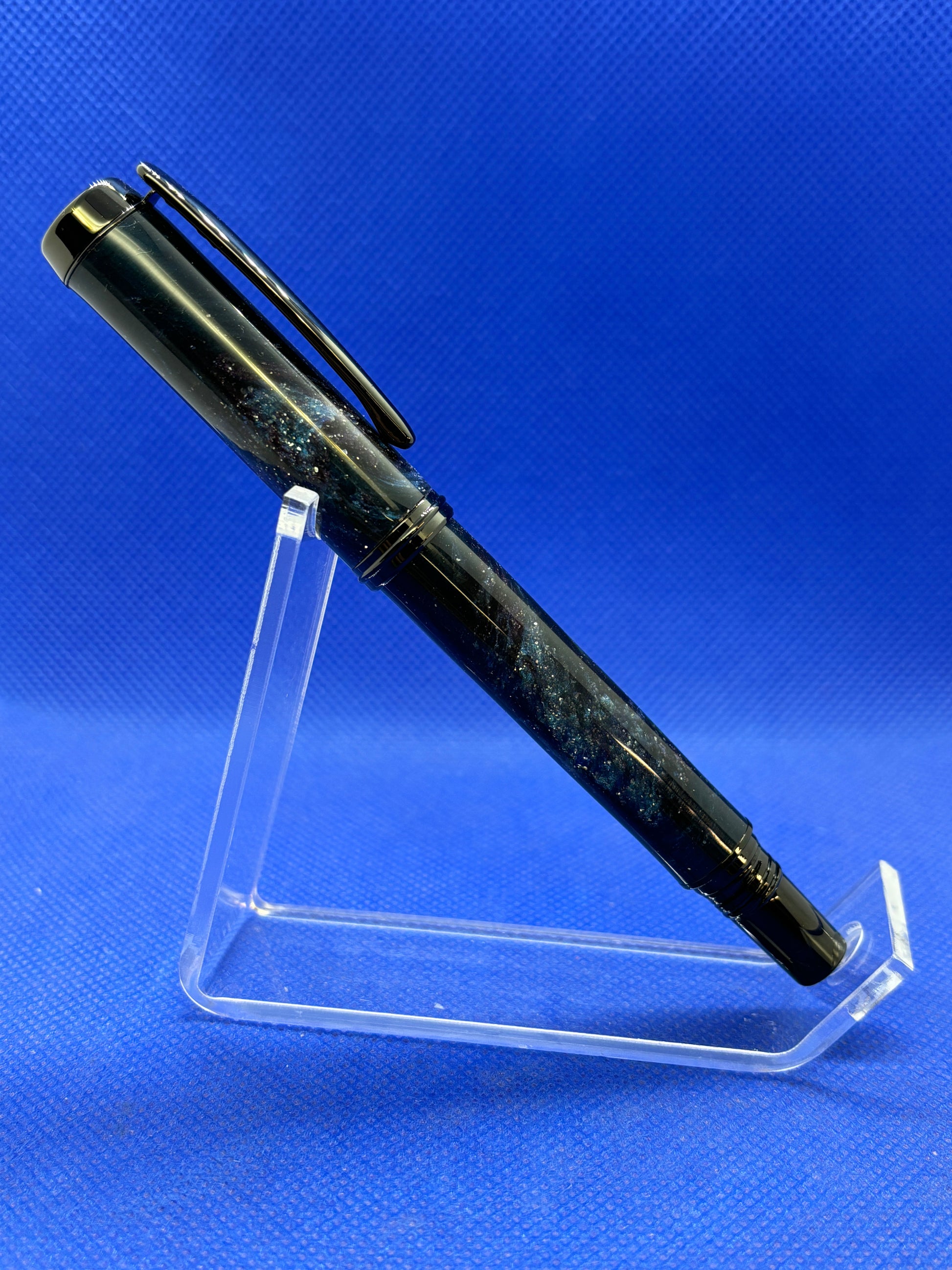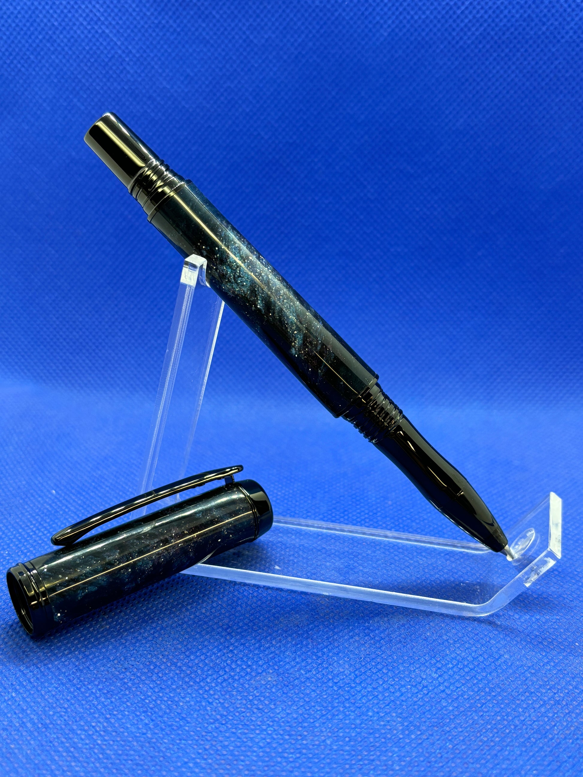 This rollerball pen features black titanium metalwork with a rich "Galaxy" resin body with deep blues, purples and reflective mica flakes. This pen uses standard Schmidt style rollerball refills.