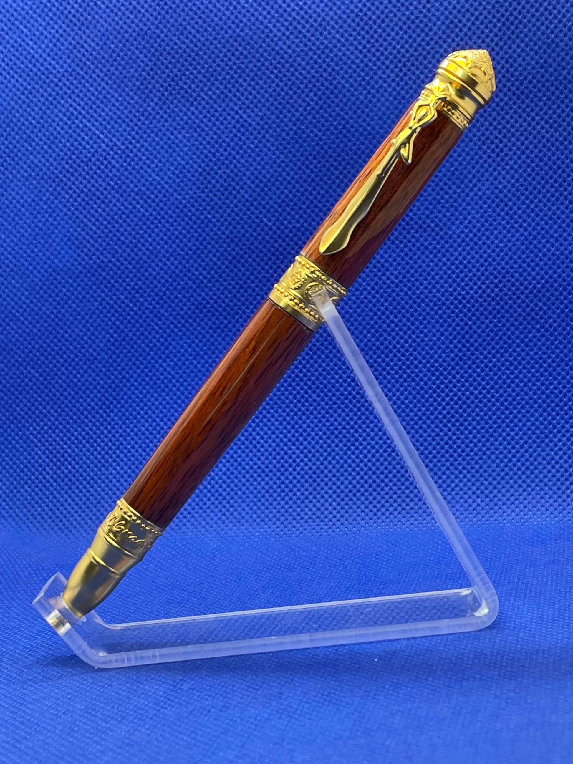 This Yoga-themed twist ballpoint pen kit features a Mandala design on cap, seven Chakra symbols on centre band and the clip depicts the tree pose. The body is vibrant bloodwood and it features gold metalwork. This pen uses standard Parker style refills.
